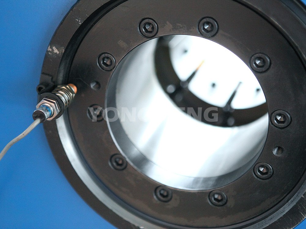 油泵安裝于油箱內浸泡在液壓油里達到科學散熱靜音的設計目的,油泵在電機驅動下,輸出液壓油,推動扣壓油缸內的柱塞運動,致使模座徑向收縮,實現模具對膠管接頭外套的擠壓。當收縮量達到千分尺預定值時,擠壓自動停止,電磁換向閥換向后,油缸內的柱塞反向運動,模具隨之張開,扣壓膠管完成。